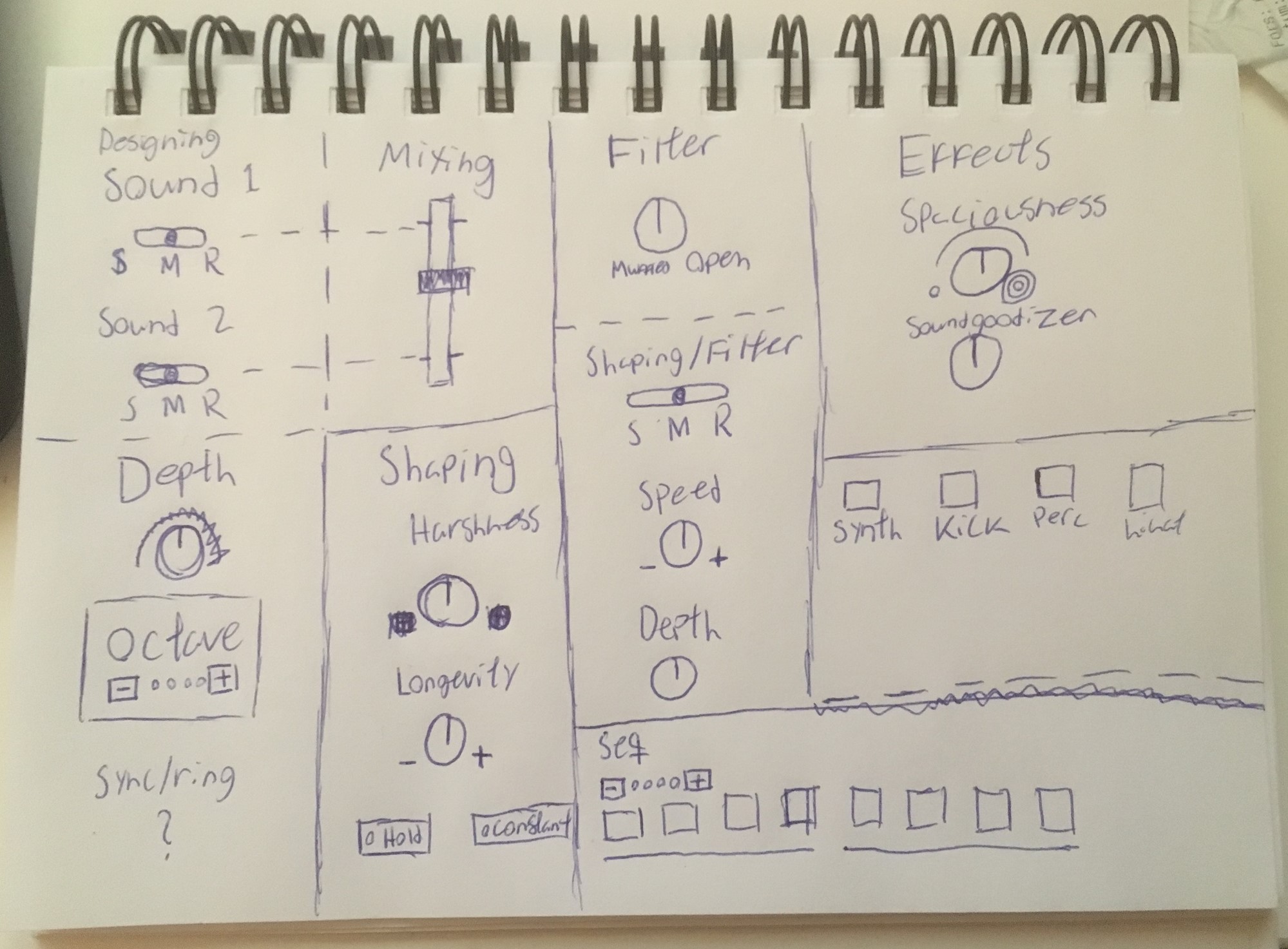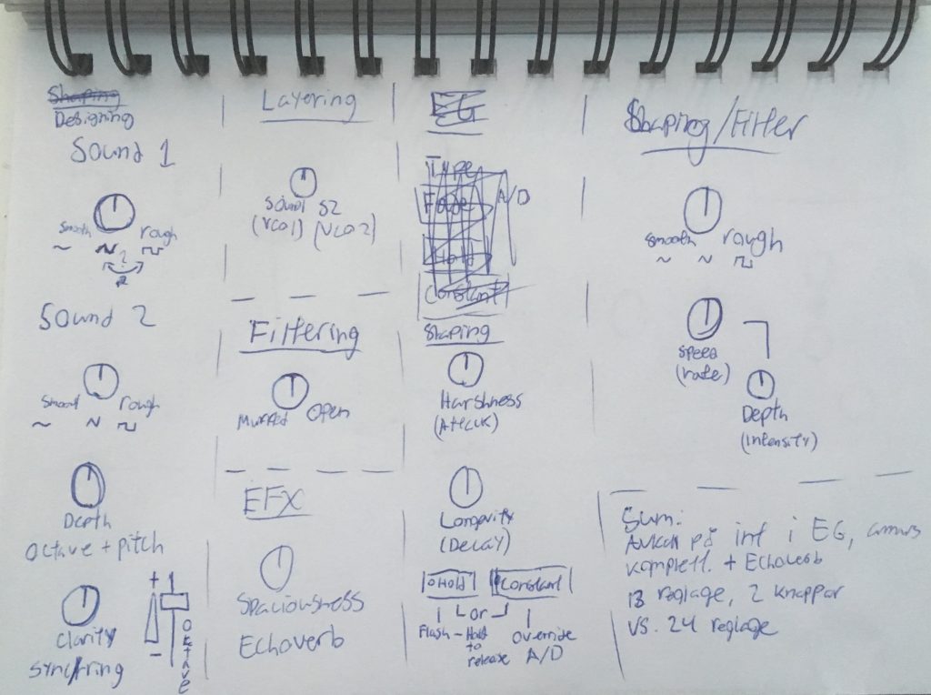 As you can see, since I drew these sketches (possibly three months ago) I’ve had some time to think about things, whether some decisions would be good decisions, and quite frankly many of them isn’t. Designing an easy to use synthesizer that’s also representative of the real deal – as well as actually being possible to make – is not easy. A beginning goal I had was to lessen the amount of knobs and buttons, and while that may be good, it does not outweigh the importance of usability. However, with the added functionality and the corrections in layout and terminology that I’ve come up with since then, I do here bring a more correct design, even if not yet perfected: