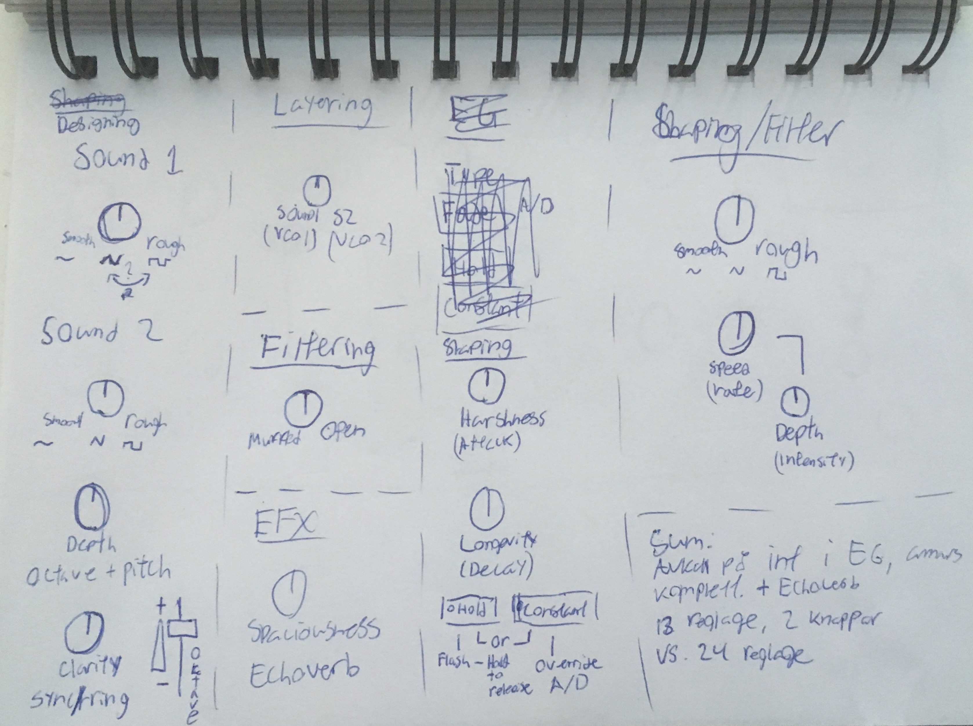 The basics is in place, no excuses to not get going. Just one question. Or two. Or three. How on earth do you concatenate features normally found on (several) quite complex synthesizers and music making things into one unit that is also easy to use? And which parameters do you choose to join with each other? And what should the names be? And how should you order all these proprietary knobs in a way that makes it easy to understand what different things do?